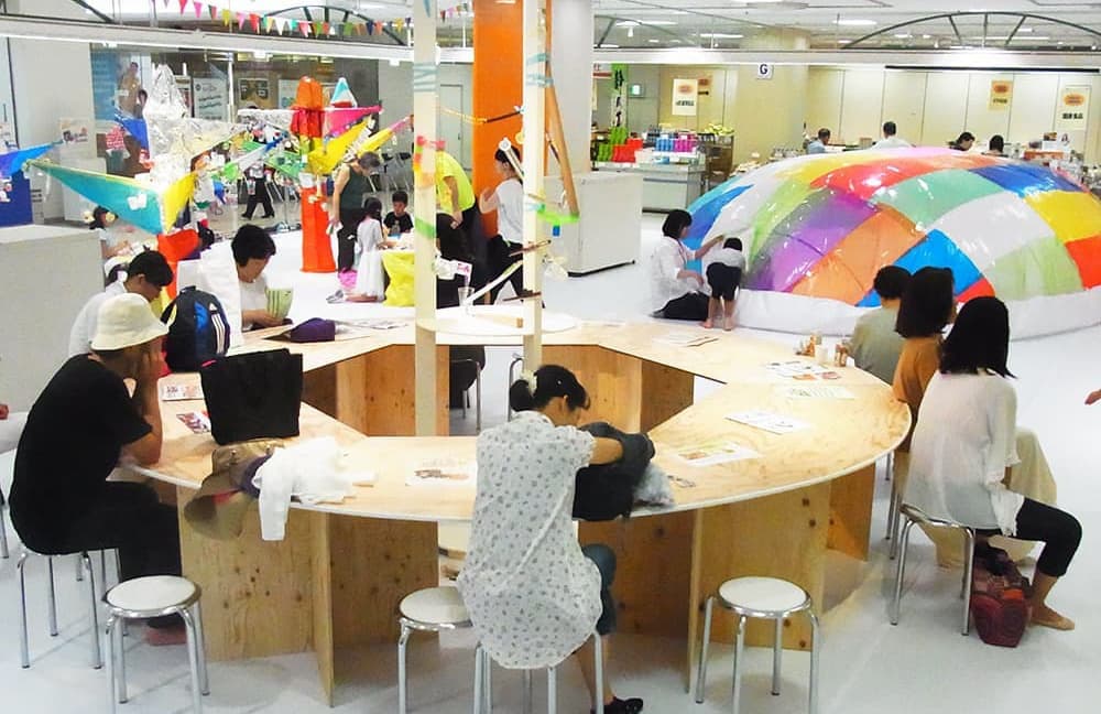 立川髙島屋の夏イベント「こどもタカシマヤ〜夏休みわくわく広場」としてあそびアート空間を開催。保護者が飲み物を飲みながらお子様の様子を見守れるように中心にテーブルを配置。6つのコンテンツを自由に行き来しながら遊んでいただけます。