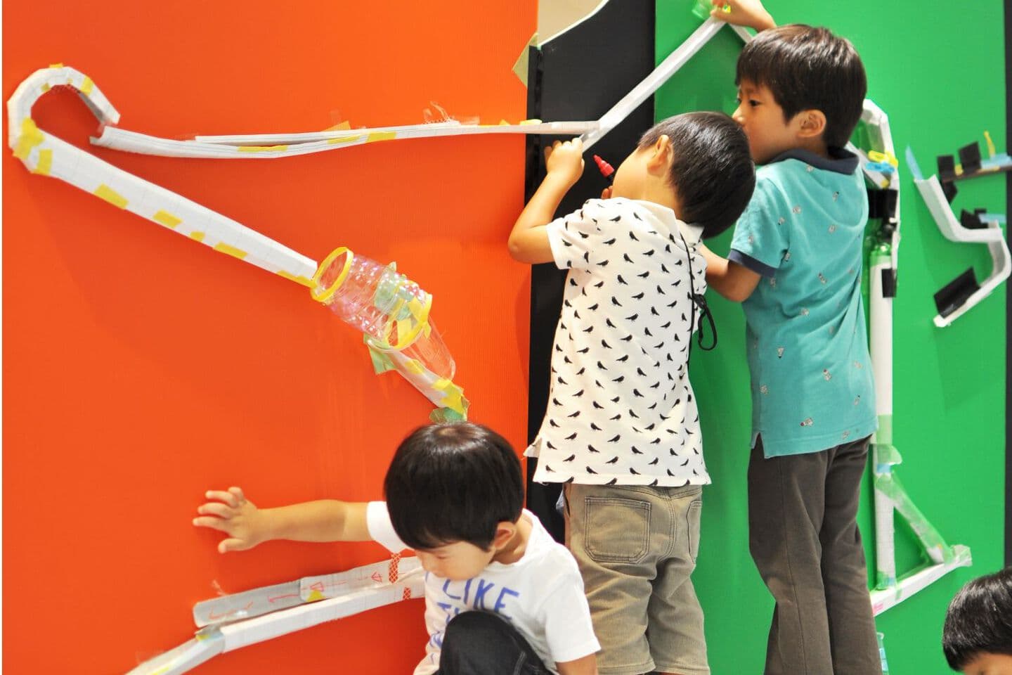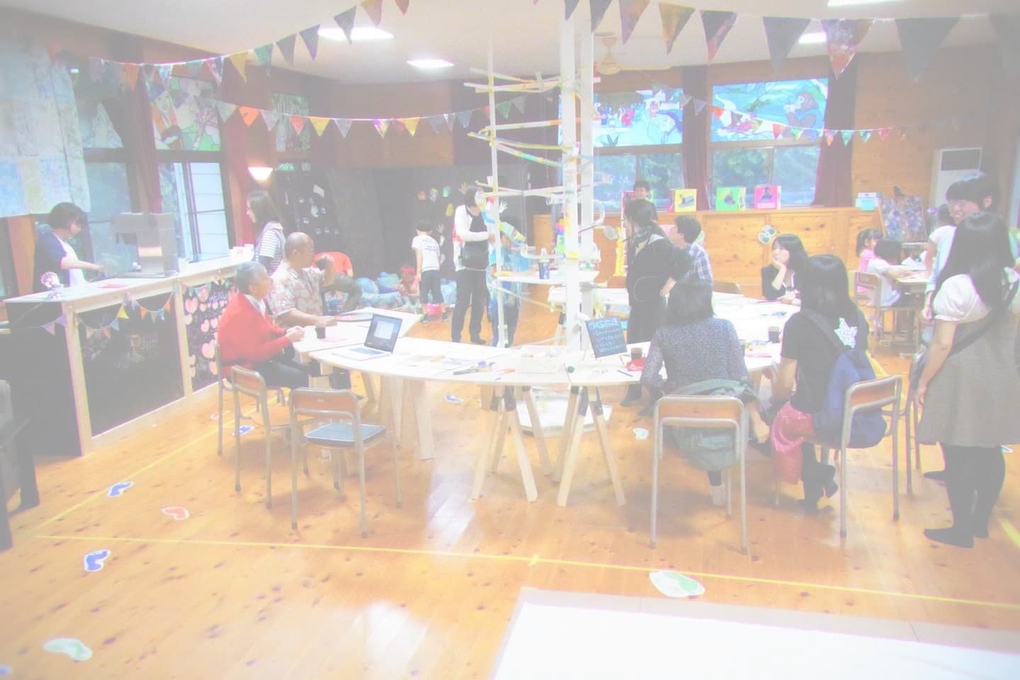 工作バイキング 工作バイキング こどもタカシマヤ あそびアートカフェ空間中央に配したテーブルで休憩しながら情報交換 らくがきWALL キラキラピカピカふわふわ 大型ビー玉ころがし タピオの大きな木をつくろう らくがきボード あそびアートカフェ 言葉コップ エキセントリック門松 竹でビー玉ころがし