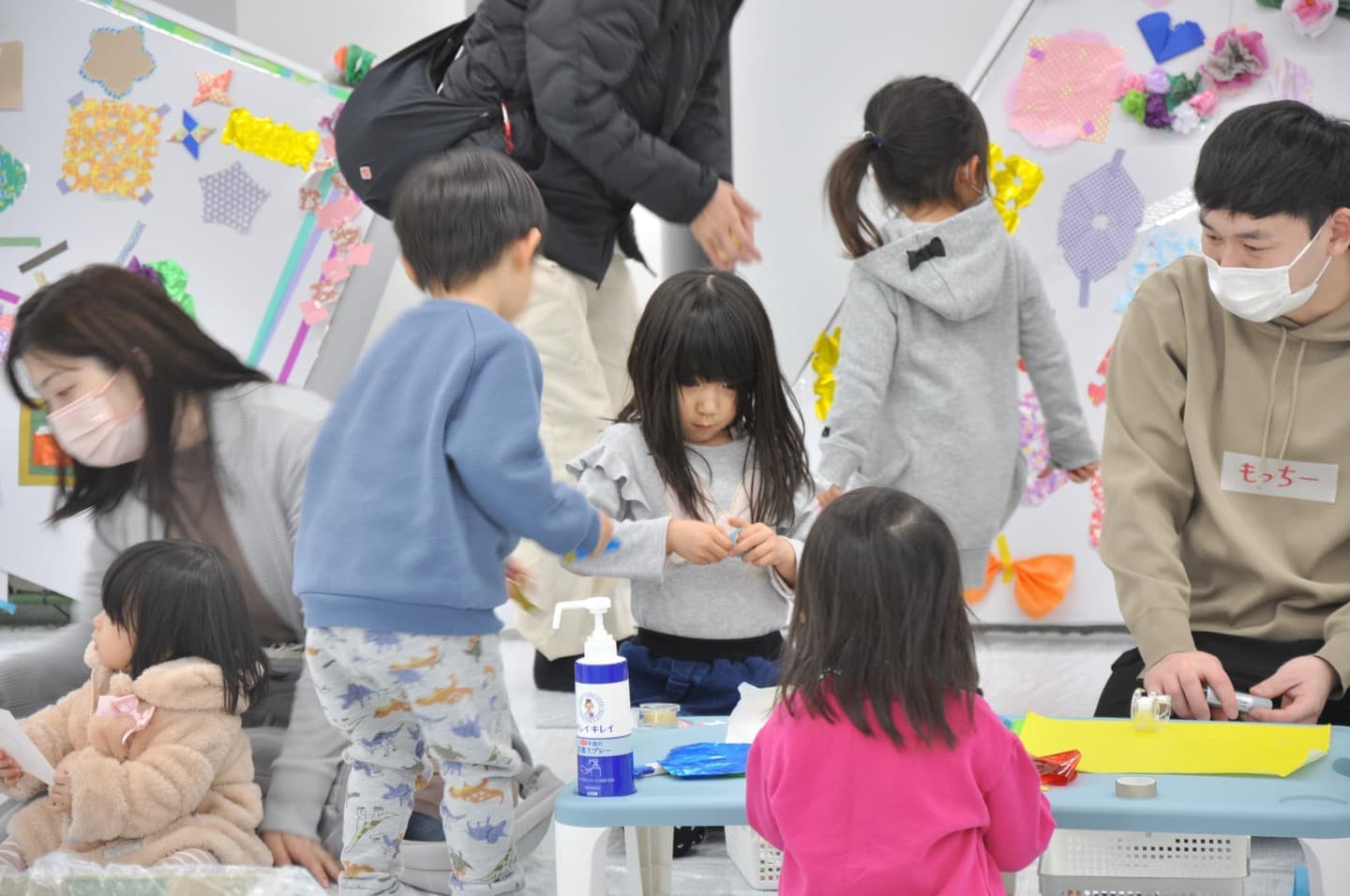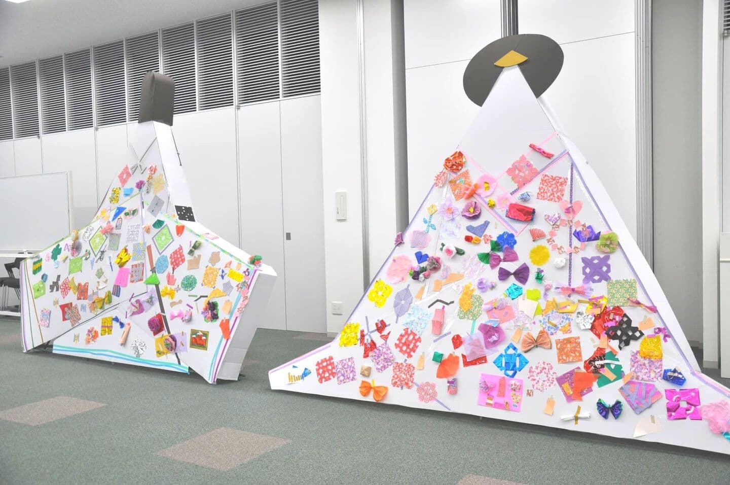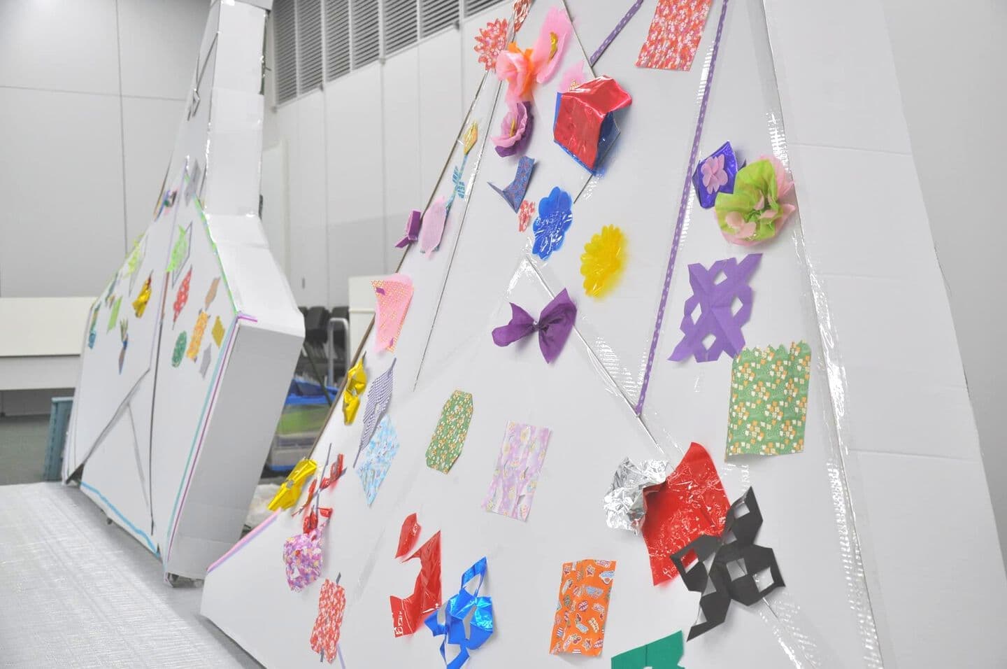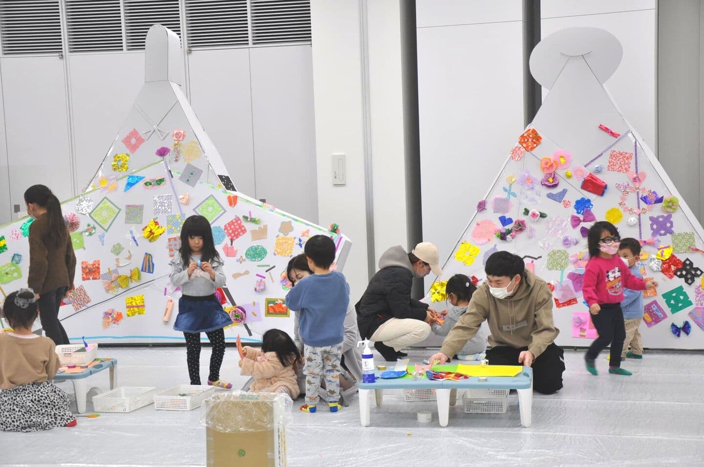 段ボール紙で制作した大型の雌雛と雄雛に、おりがみやカラーセロファンなどの素材を自由に使って飾りをつけていきます。真っ白だったお雛様が、みんなの力で、少しずつカラフルに変化していきます。