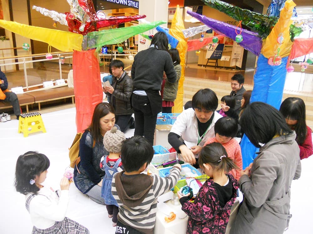タピオの大きな木をつくろう プラスチックを回収するプロジェクト。ご自宅で不要になったプラスチック製品を回収します。ここでは、ガチャ玉を自由に飾って自分だけのアートの実をつくって、大きなアートの木をみんなでつくります。 ■会期:2015年 ■会場:泉パークタウン タピオ(宮城) ■対象:どなたでも ■時間:営業時間内