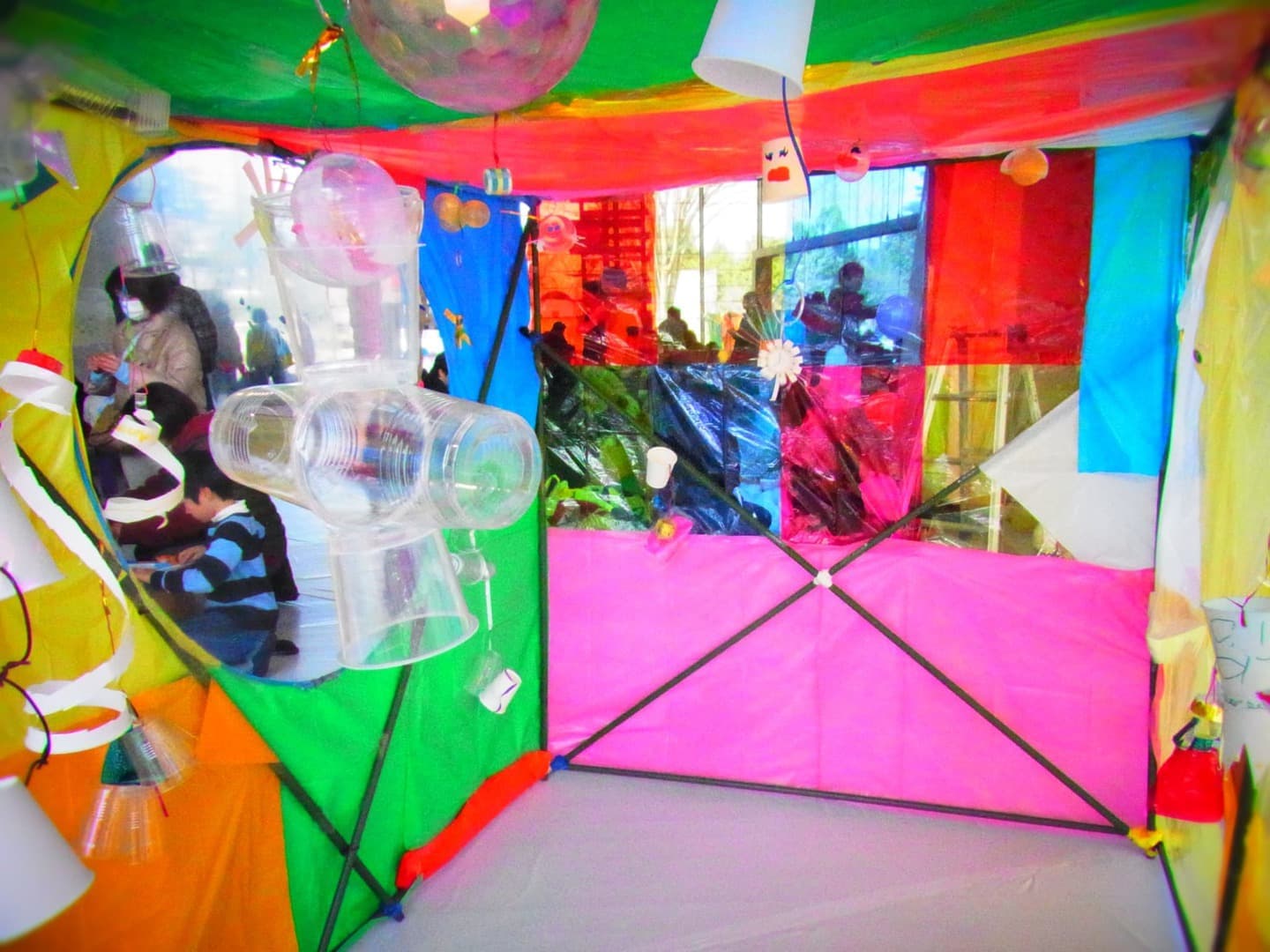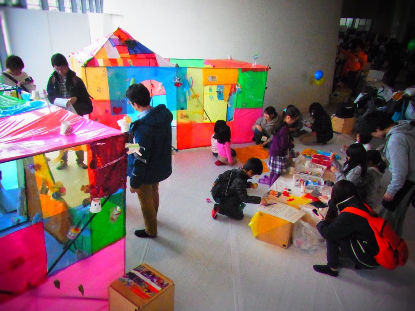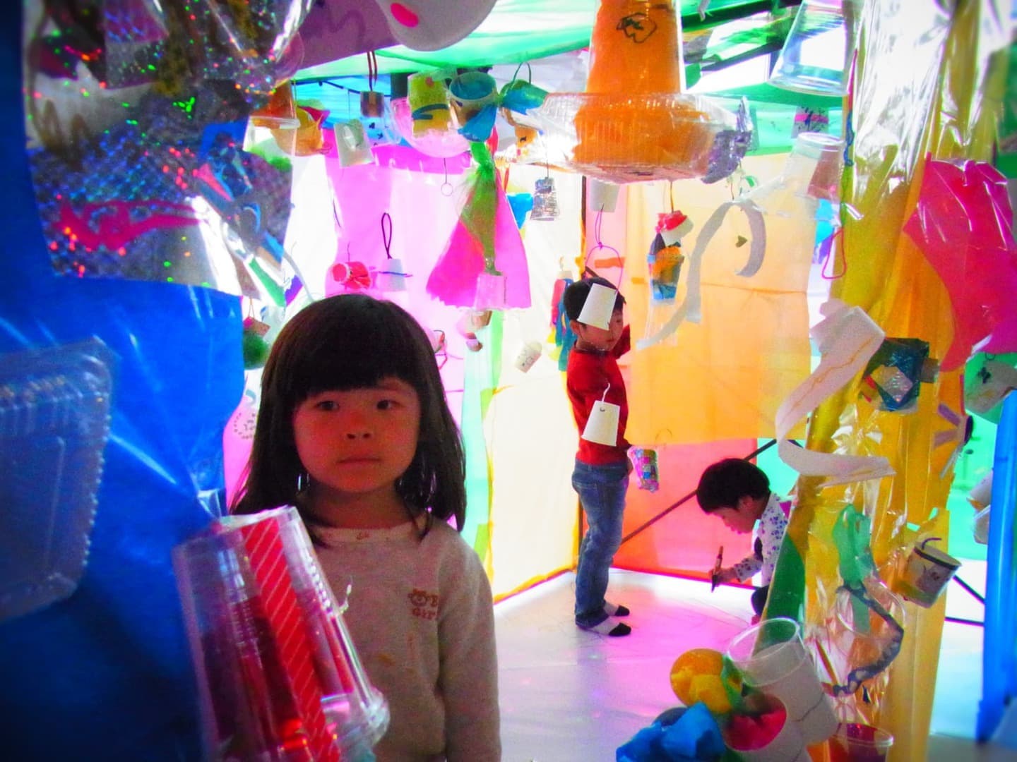 JTB旅いくキッズフェスタ〜1000人でつなぐプログラム。ビニールシートやホイルなどのキラキラ素材を自由に使って部屋を飾ります。